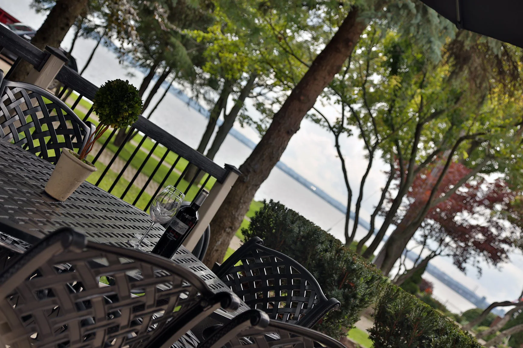 Dining with a View: French doors open to a lake-view patio with seating and a BBQ.